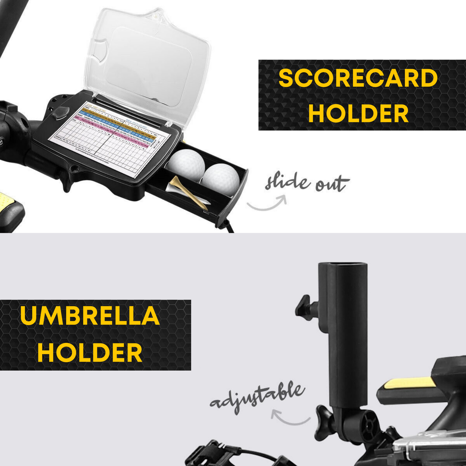 - High quality and innovative accessories: A Scorecard Holder, Sand Bucket, Umbrella Holder, USB Charger Port, Beverage Holder, Seat, Carrying Bag, Rain Cover are included.